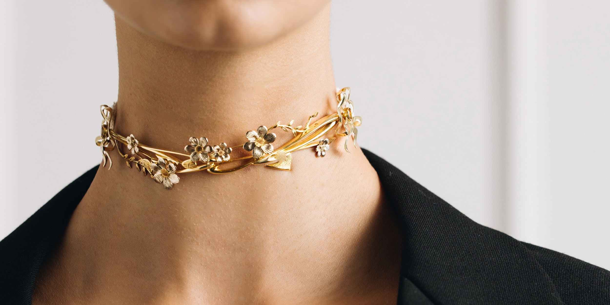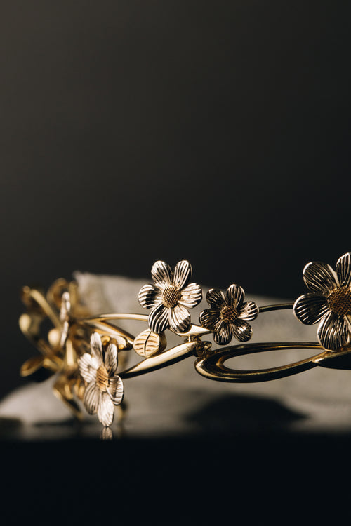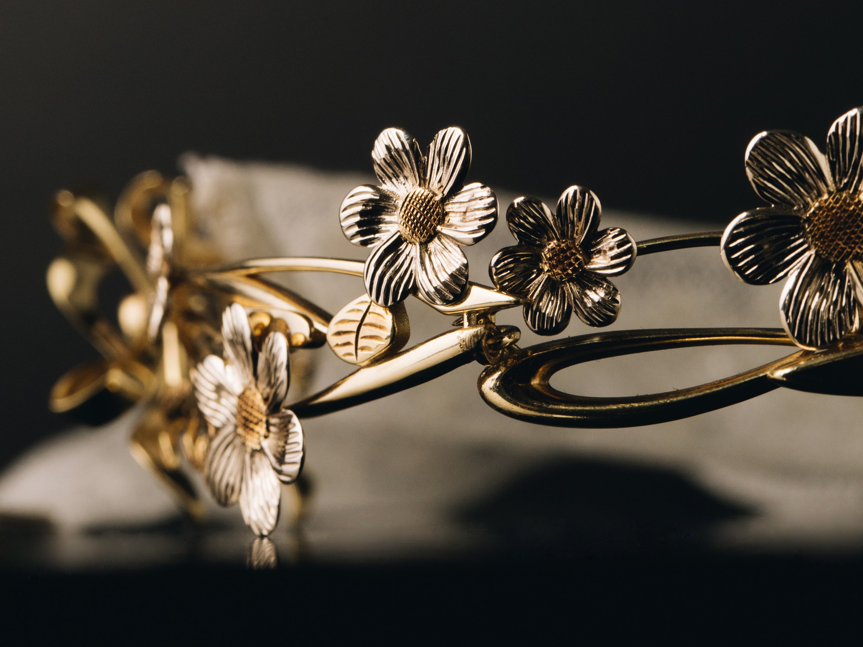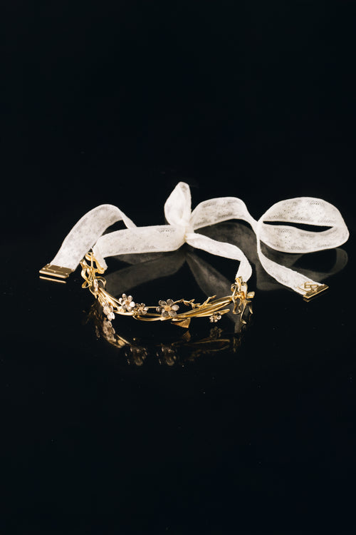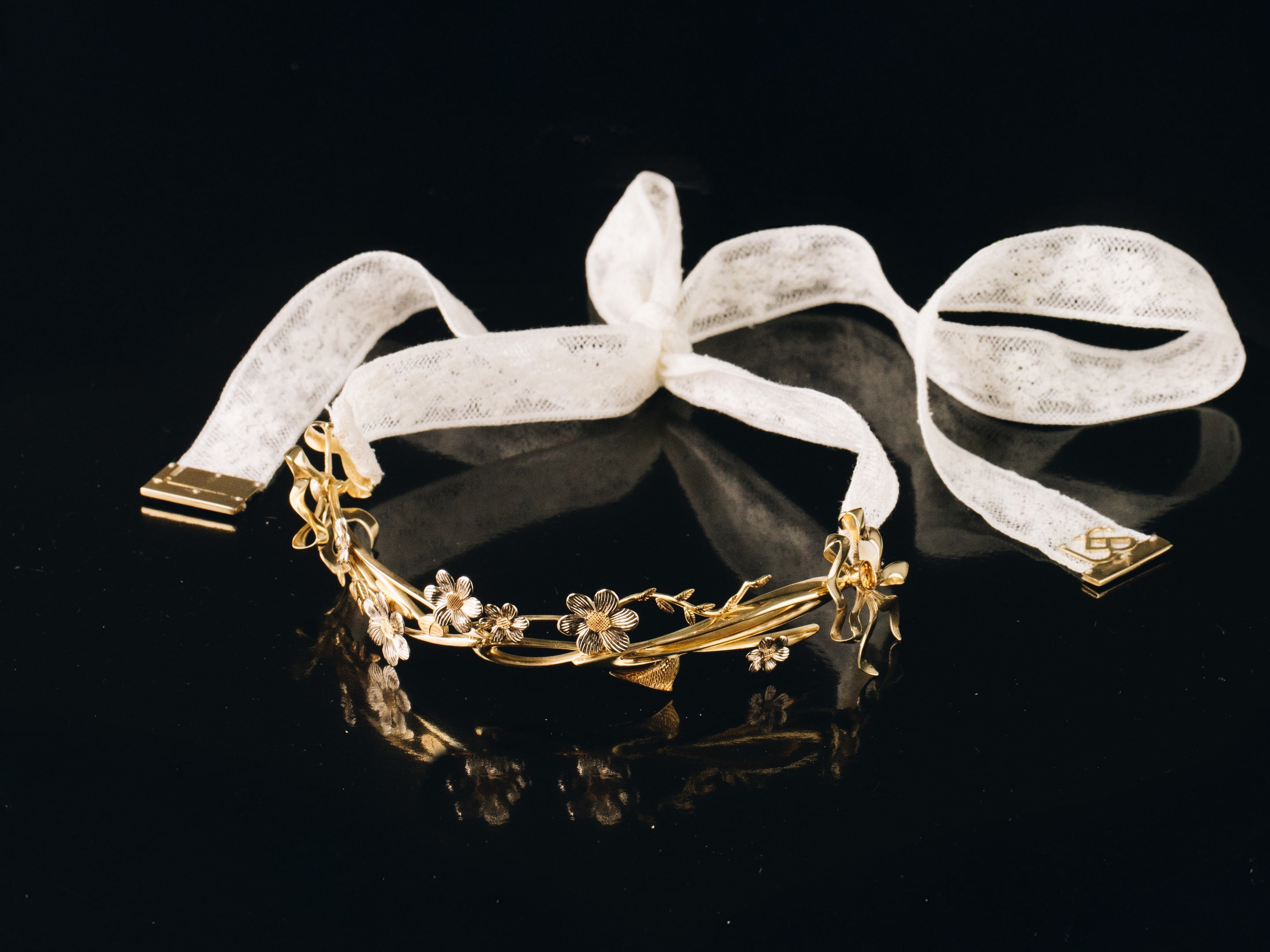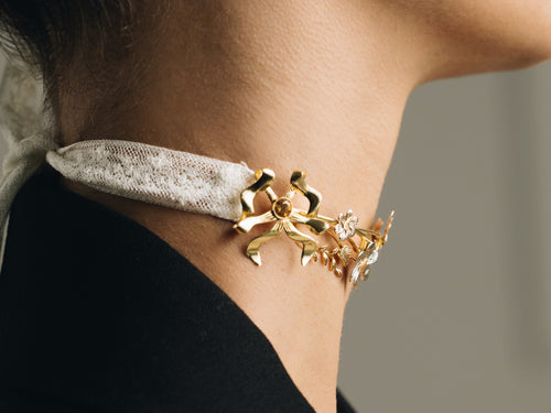 Collar de oro amarillo envejecido con flores en oro blanco 18K y 2 citrinos amaraillos 0,18Q total. Acabados con grabado a mano y cintas valencienne con terminales en oro amarillo.
