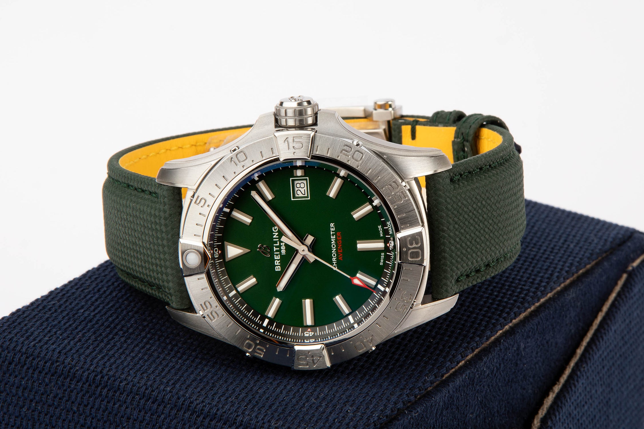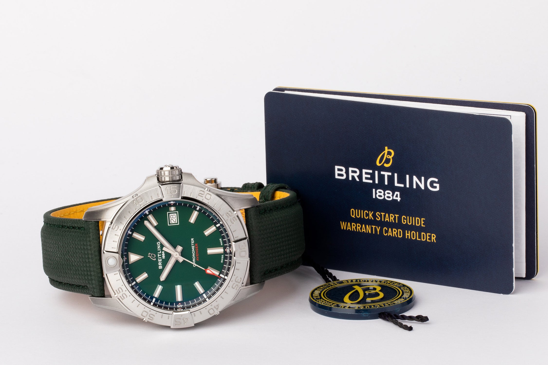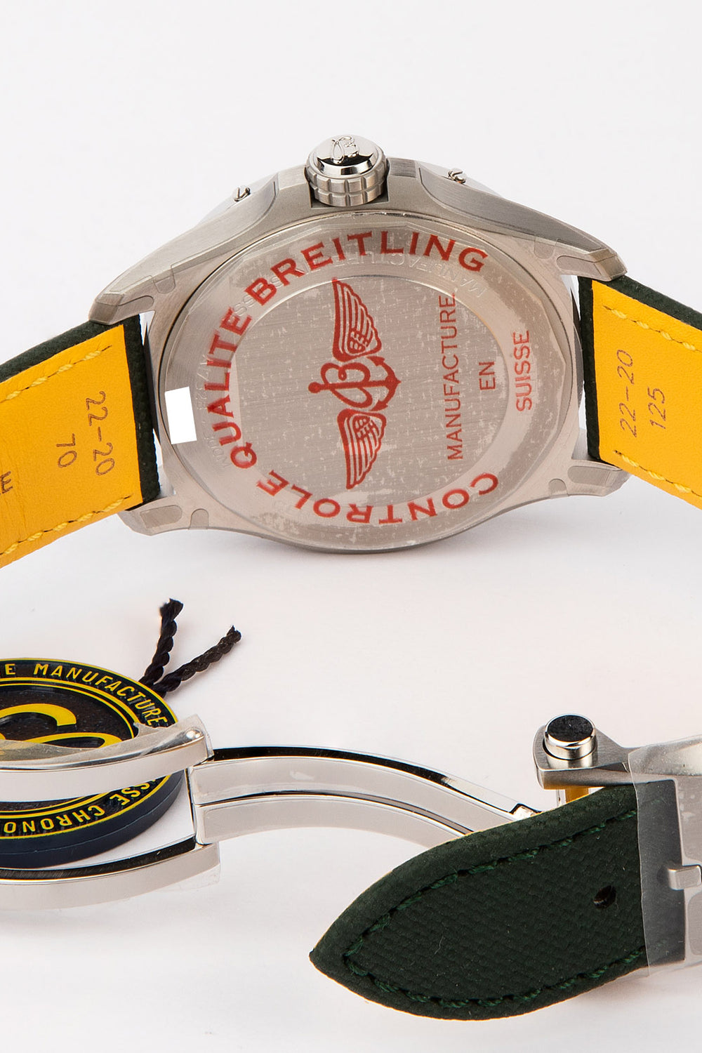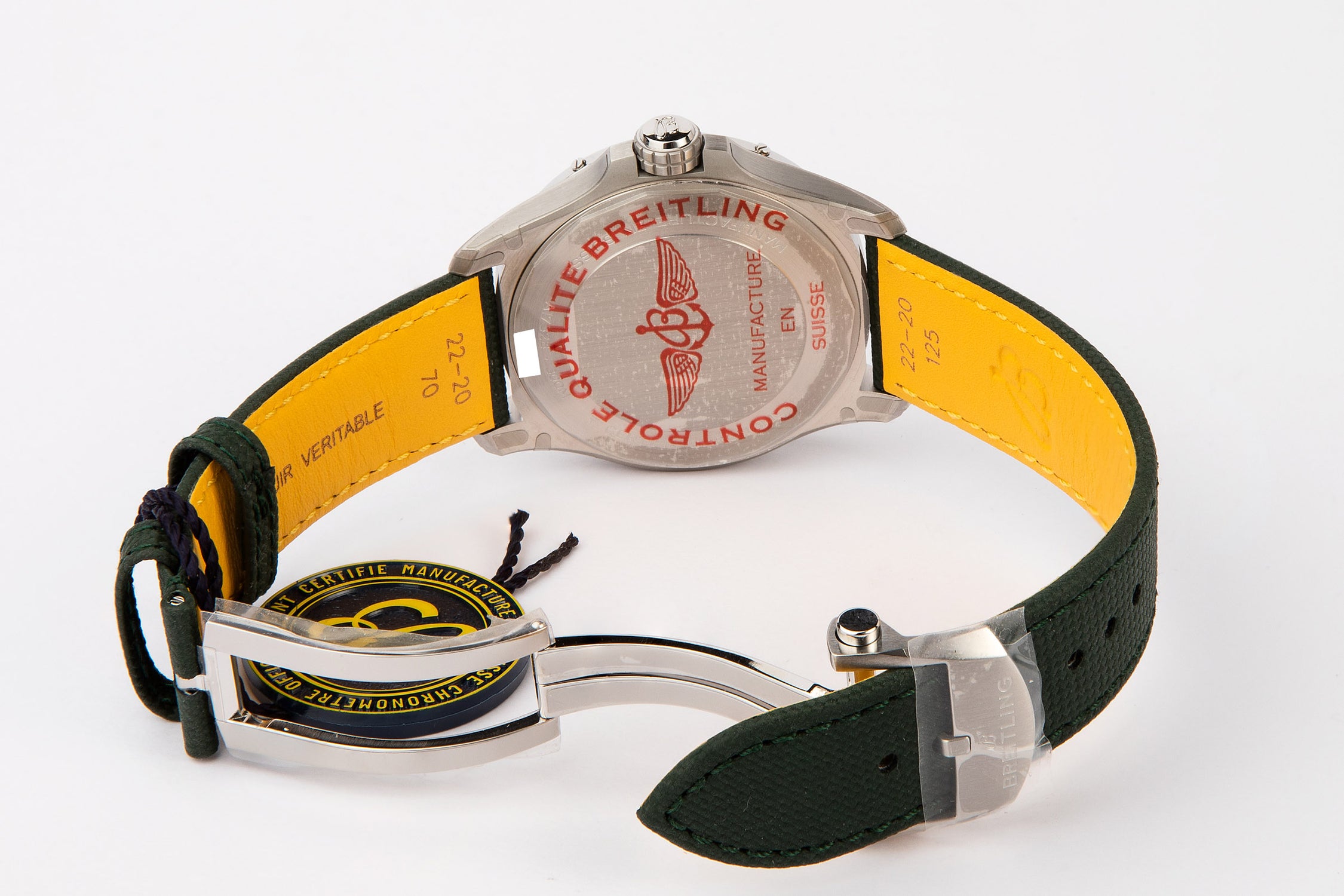 Certified Pre-Owned: Relojes certificados Caja de acero de 42 mm. Movimiento mecánico automático Breitling 17 Fecha Esfera verde Cristal de zafiro Resistencia al agua: 30 ATM Diámetro: 42 mm Brazalete de piel de vaca con cierre desplegable Reloj nuevo, sin uso, con estuche y documentación original. Garantía oficial Breitling Internacional PVP: 4.600€ OFERTA: 3.280€