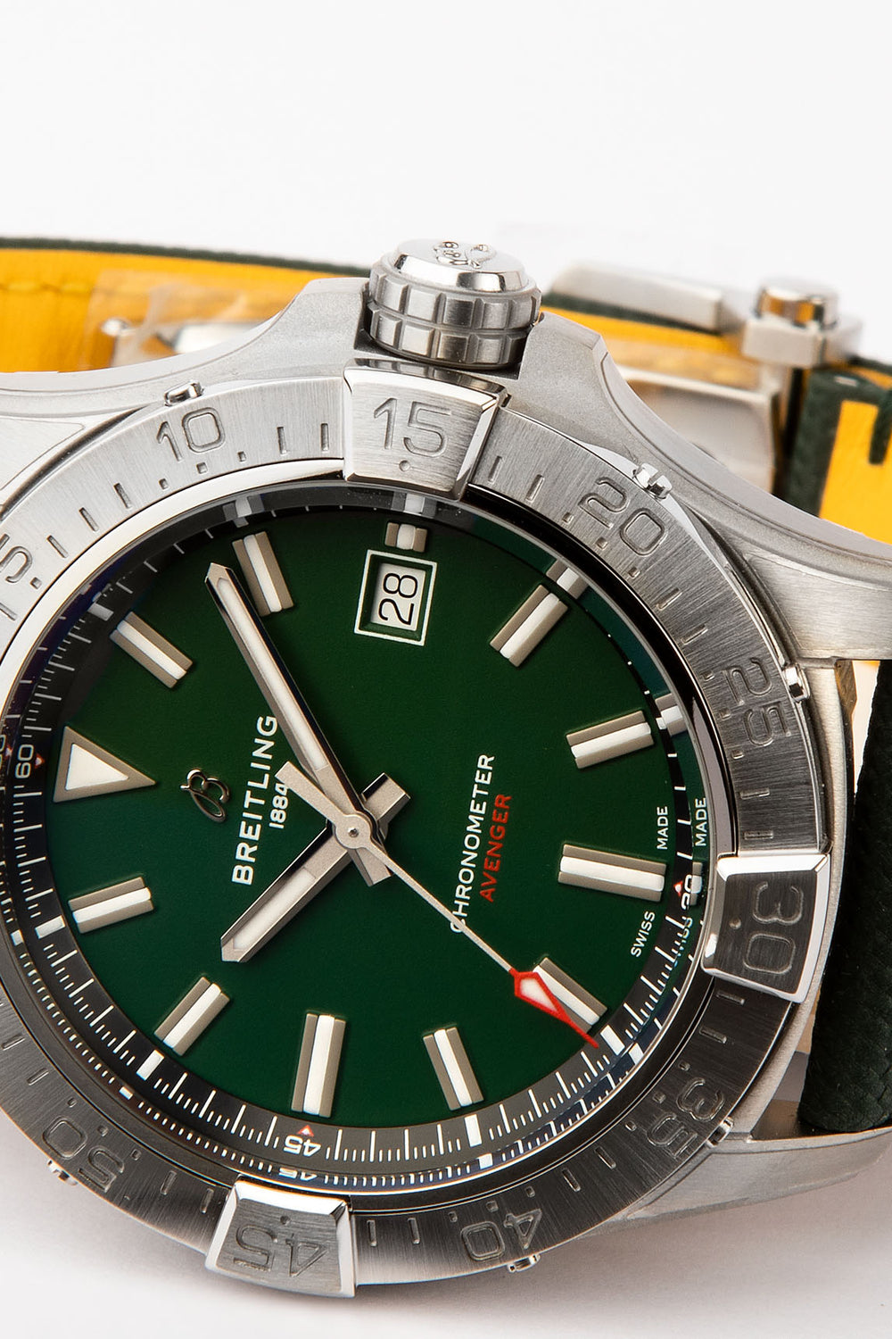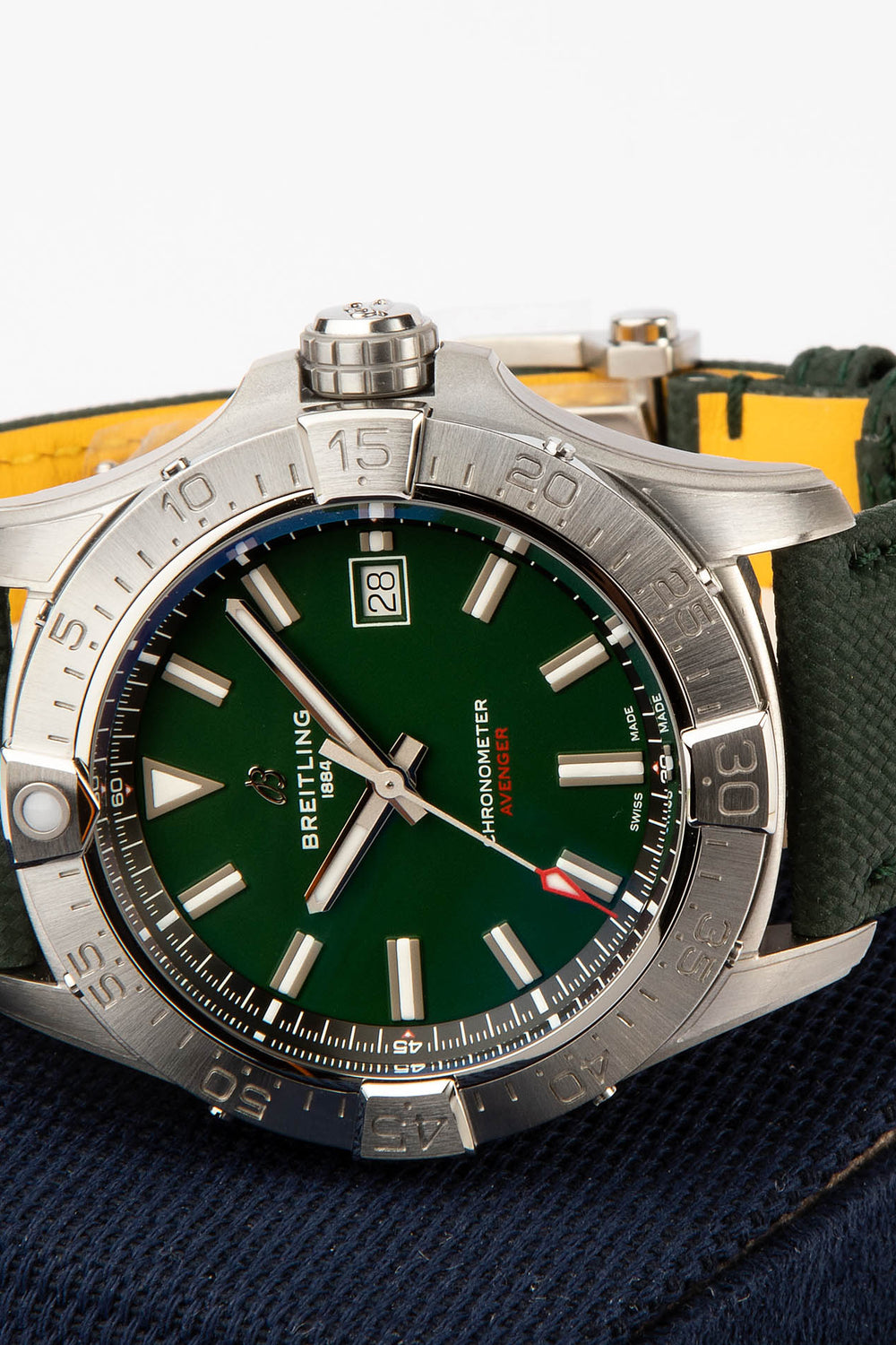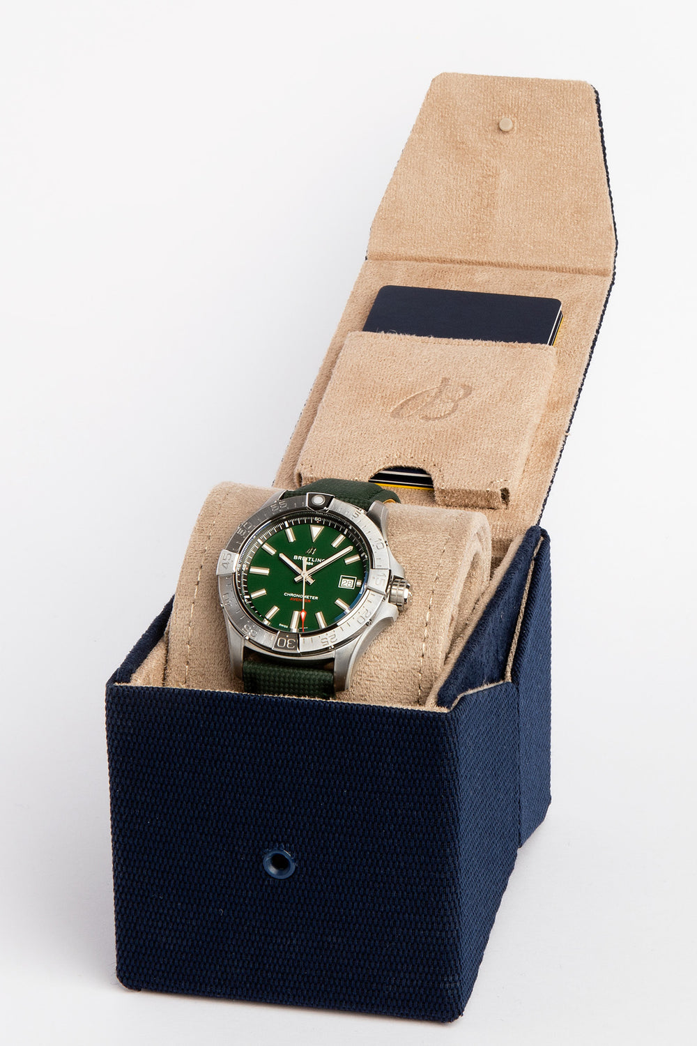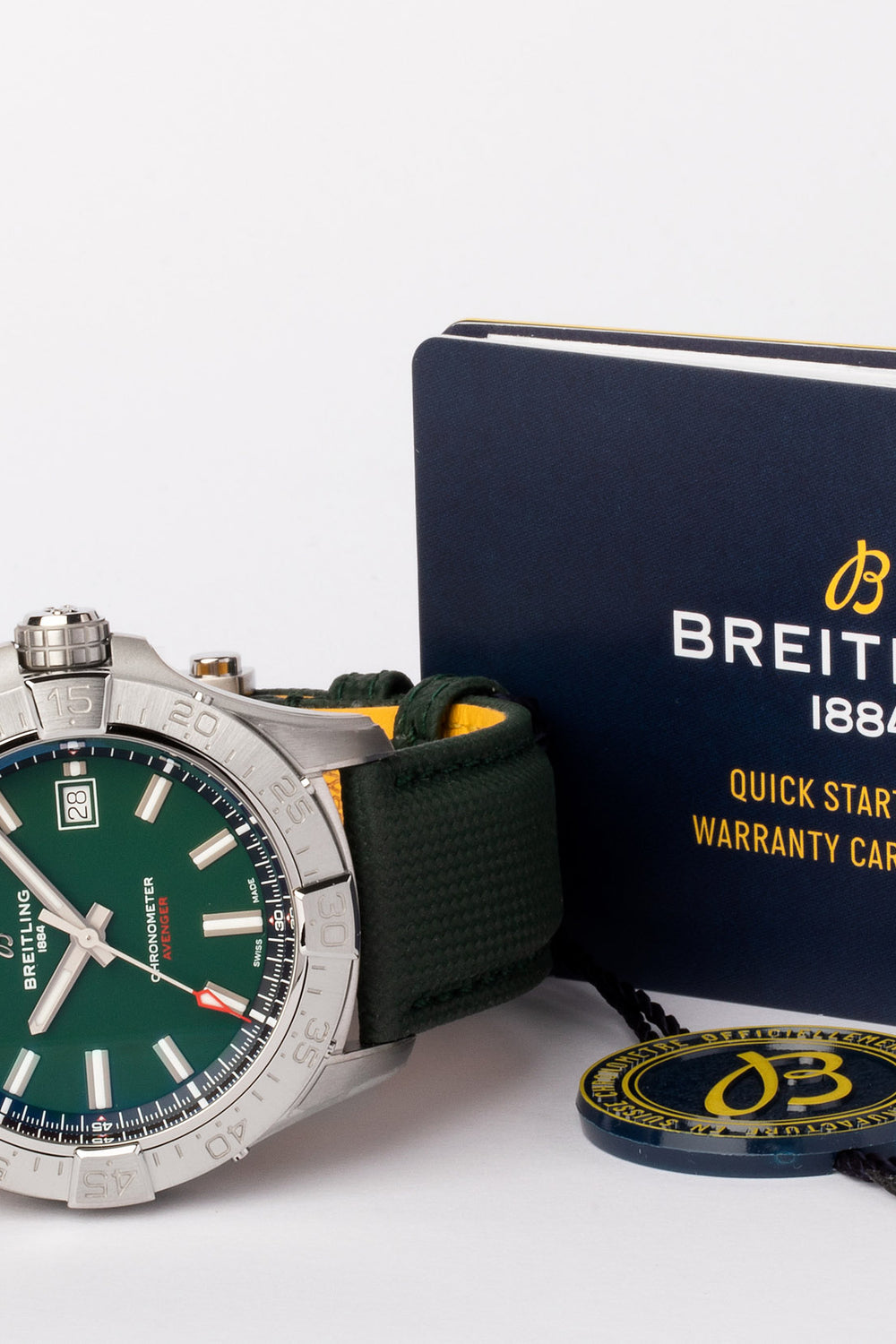 Certified Pre-Owned: Relojes certificados Caja de acero de 42 mm. Movimiento mecánico automático Breitling 17 Fecha Esfera verde Cristal de zafiro Resistencia al agua: 30 ATM Diámetro: 42 mm Brazalete de piel de vaca con cierre desplegable Reloj nuevo, sin uso, con estuche y documentación original. Garantía oficial Breitling Internacional PVP: 4.600€ OFERTA: 3.280€