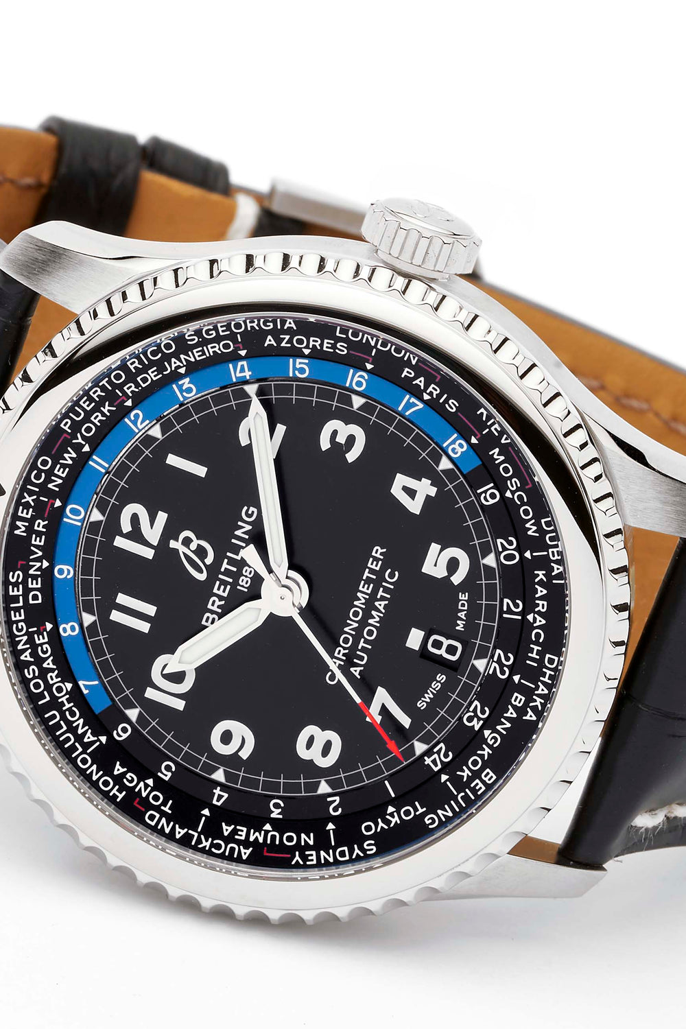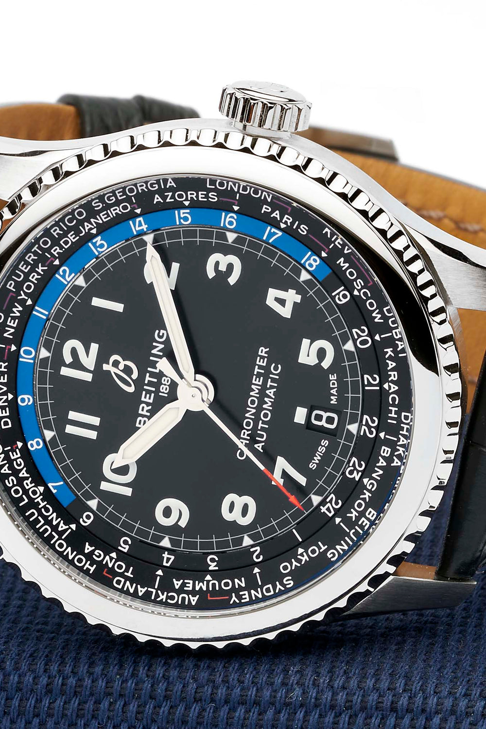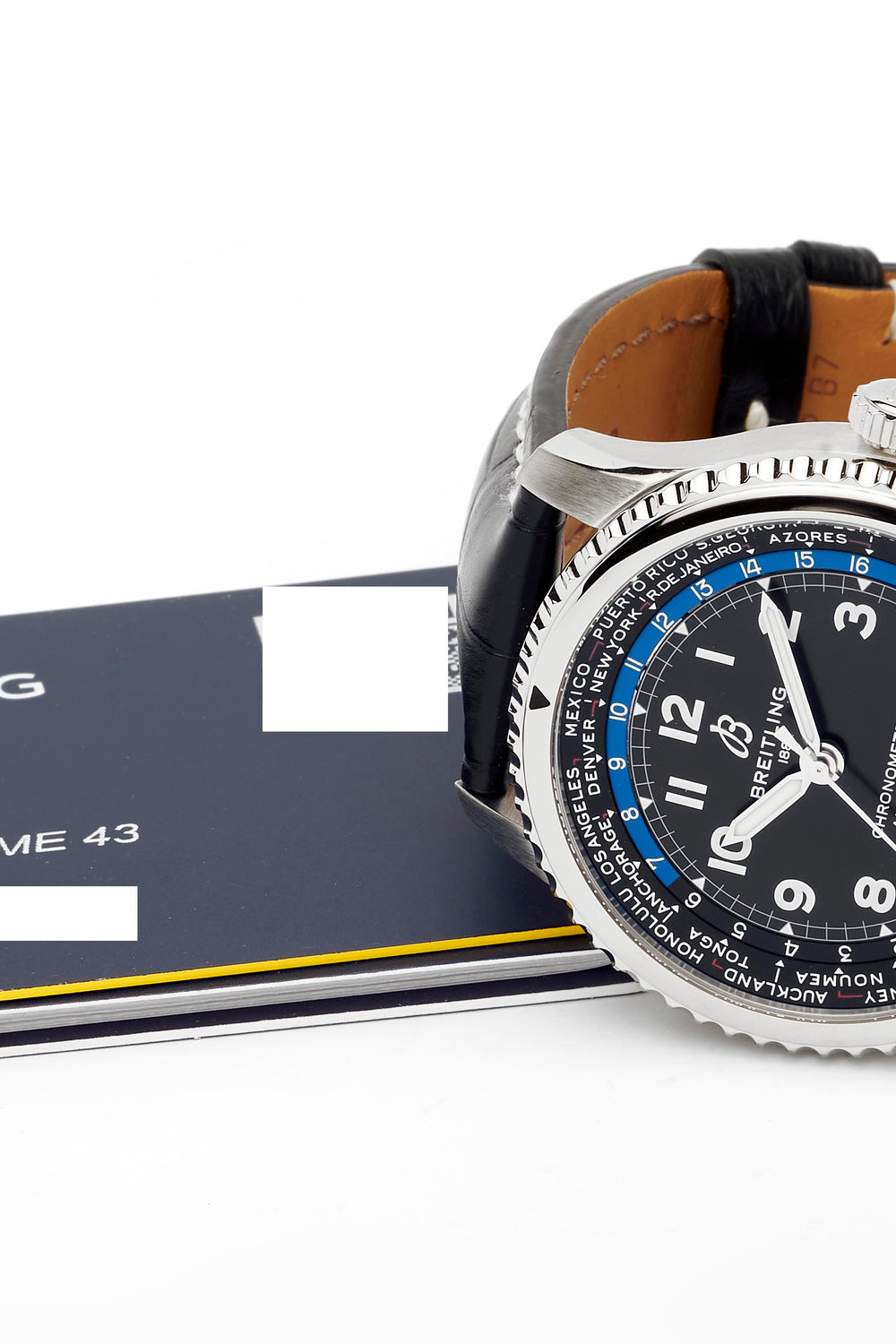Certified Pre-Owned: Relojes certificados Caja de acero de 43mm. Movimiento mecánico automático Breitling calibre B35 Fecha Horas mundiales Esfera negra Cristal de zafiro Resistencia al agua: 10 ATM Diámetro: 43mm Grosor: 14,35mm Brazalete de piel con hebilla ardillón Reloj nuevo, sin uso, con estuche y documentación original. Garantía oficial Breitling Internacional PVP: 8.000€ OFERTA: 6.080€