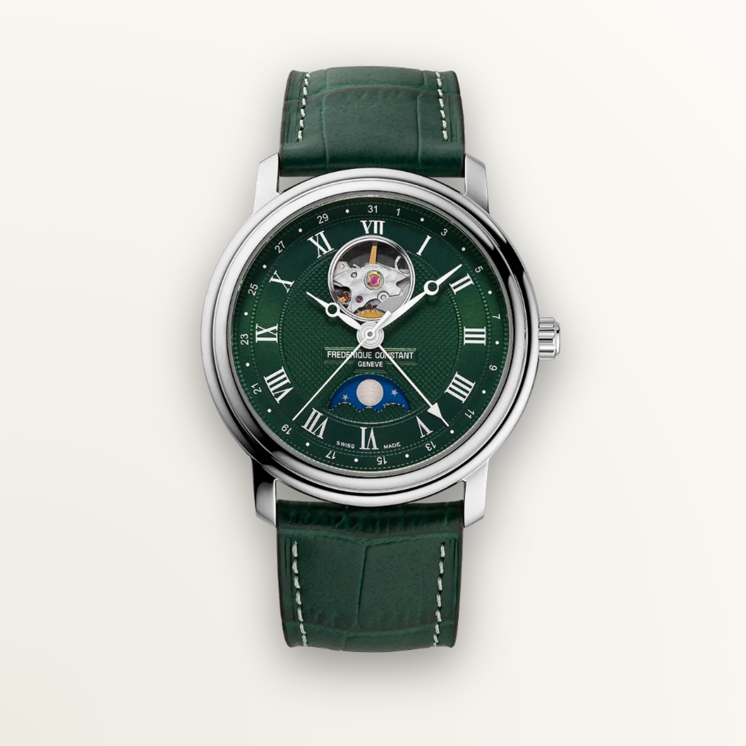 Descubra el reloj Classics Heart Beat Moonphase Date, una sofisticada pieza relojera que revela el alma de su movimiento. Su caja pulida de acero inoxidable de 40 mm alberga el calibre automático FC-335, que ofrece una reserva de marcha de 38 horas y una frecuencia de 28 800 alt/h, visible a través de la ventana «Heart Beat» a las 12 horas. La esfera verde mate está realzada por un elegante guilloché «Clous de Paris» en el centro, números romanos blancos impresos y una graduación de la fecha en el borde. Las agujas blancas de las horas, los minutos, los segundos y la fecha garantizan una legibilidad óptima, mientras que la fase lunar añade un toque de poesía. Protegido por un cristal de zafiro convexo antirreflectante y un fondo de caja transparente, este reloj es hermético hasta 6 ATM (60 m/197 pies) y se acompaña de una correa de piel de becerro verde con costuras crudas, que combina elegancia clásica y comodidad.