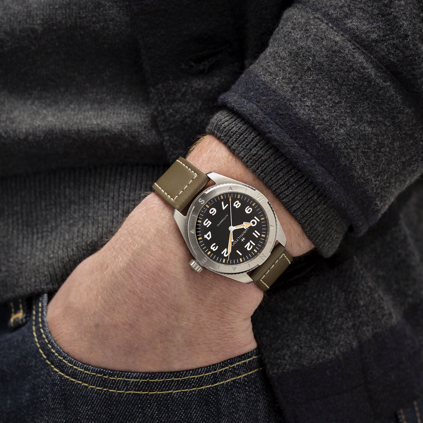 Prepararse para la naturaleza ahora es más fácil gracias al Khaki Field Expedition y su nueva correa NATO. Un reloj de aventura todoterreno con diseño de brújula que te permite navegar en tu próxima excursión con la ayuda del sol. Con una caja de acero inoxidable de 37 mm y una correa textil NATO negra, está equipado con una corona atornillada y una esfera azul arenada, lo que lo convierte en tu reloj más resistente hasta la fecha.