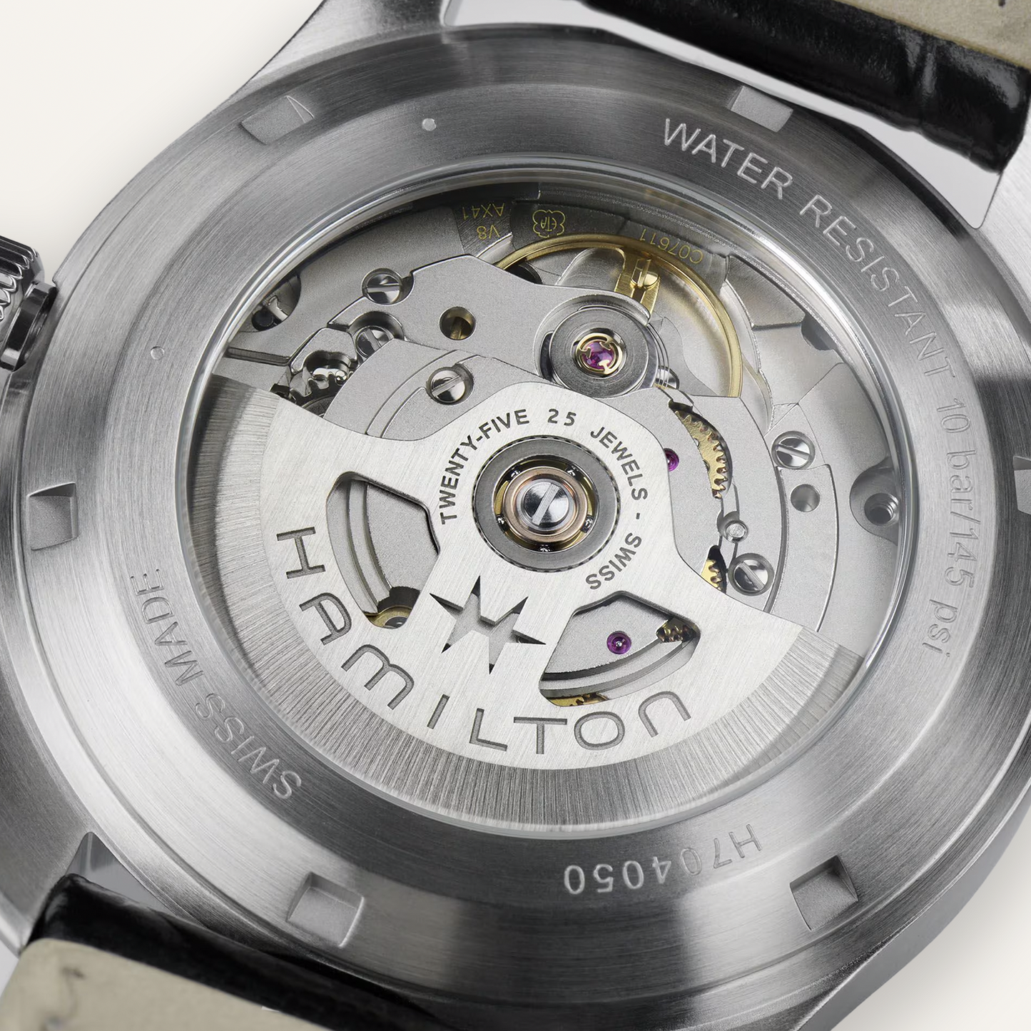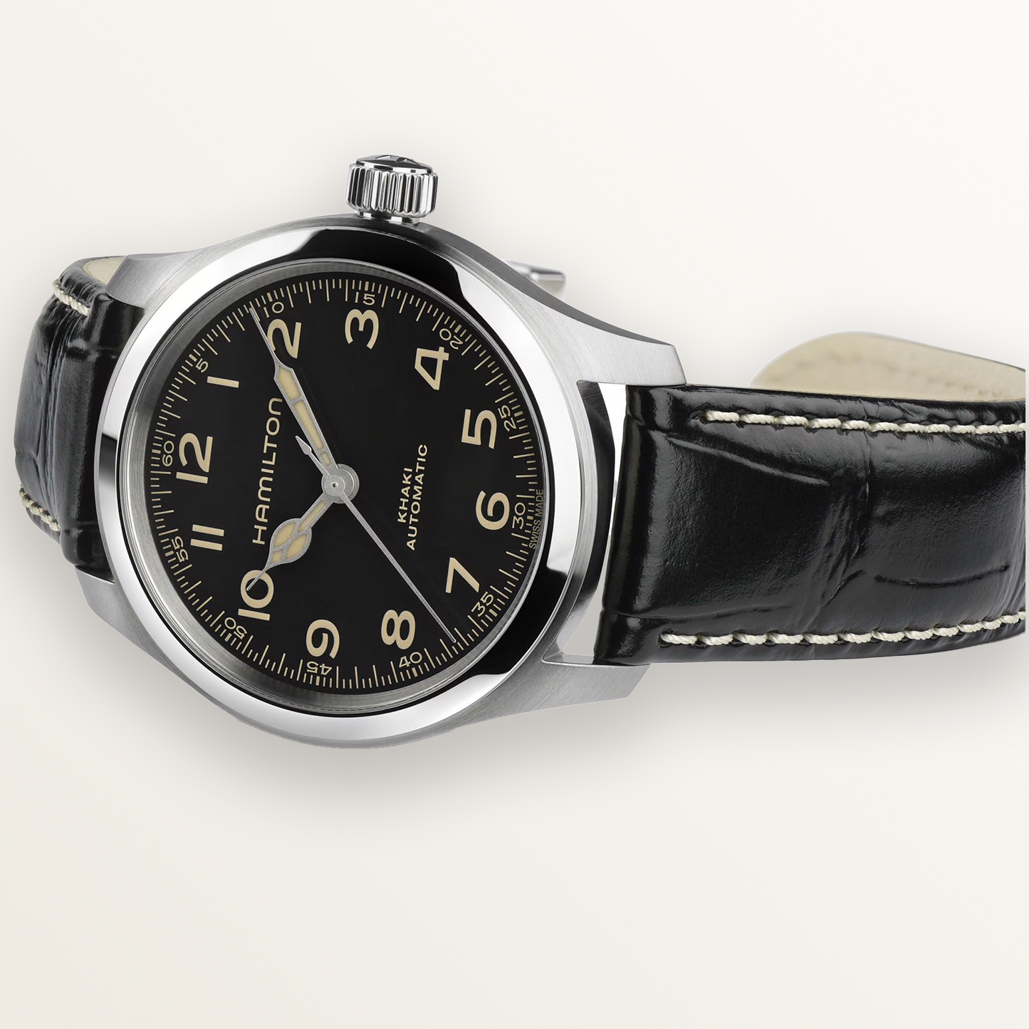El Khaki Field Murph Auto de 38 mm ya está aquí. Uno de los relojes más famosos de la ciencia ficción, conocido por sus seguidores como "el Murph", ahora viene en una caja de acero inoxidable de 38 mm. Gracias a su esfera negra de gran legibilidad, sus agujas beige de estilo vintage con acabado de Super-LumiNova® y su correa de piel negra, refleja los códigos estéticos clave de su predecesor de 42 mm. Equipado con el movimiento automático H-10 y con una reserva de marcha de 80 horas, este Khaki Field Murph Auto cautiva los corazones de los enamorados de los relojes más pequeños.