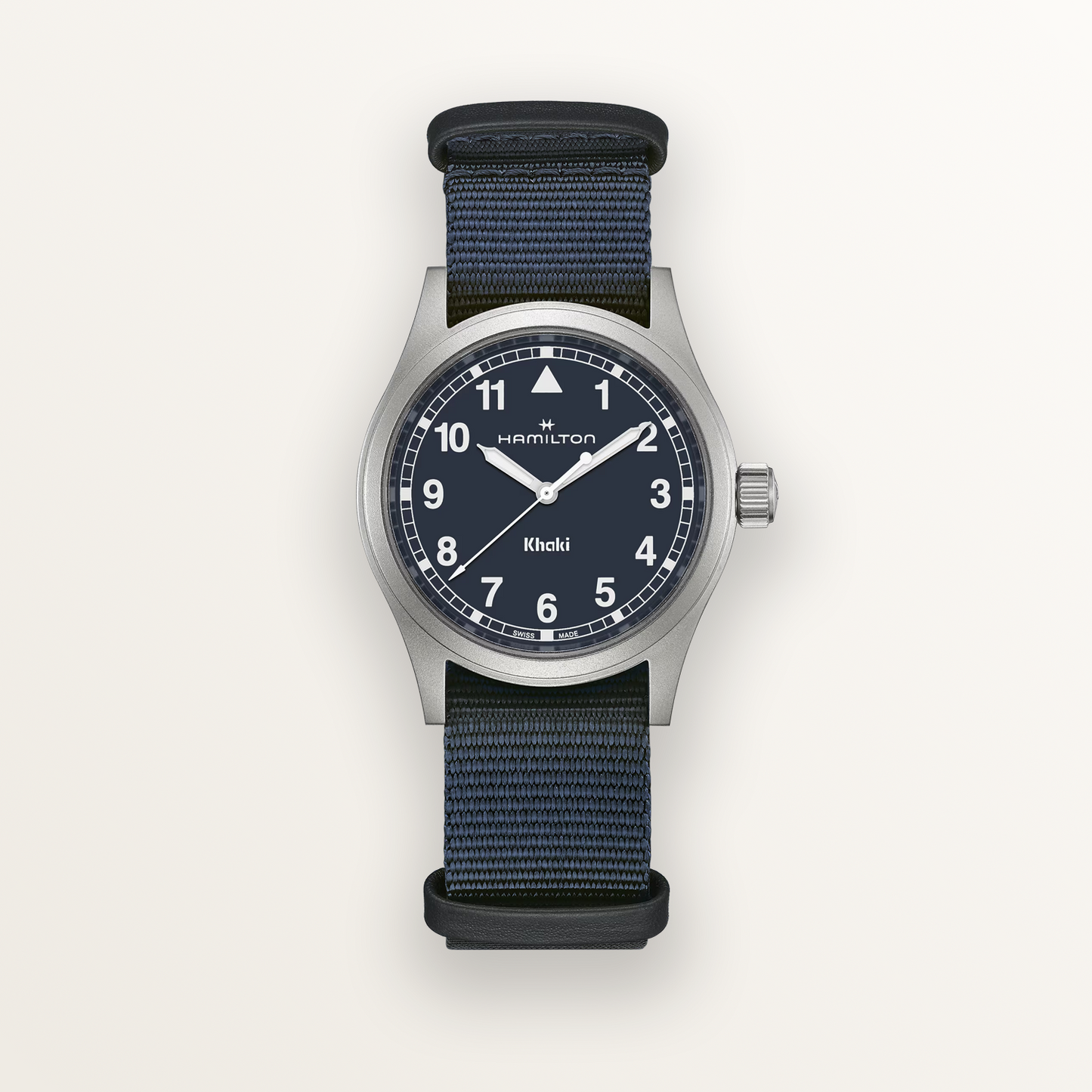 El Khaki Field Quartz expresa el regreso al legado militar de Hamilton a través de la sencillez en el diseño. La esfera presenta una tipografía clara con números arábigos más rectos y un minutero de vía ferroviaria. La paleta de colores es discreta, con su elegante esfera negra realzada con índices con Super-LumiNova® verde claro. El reloj incluye una correa NATO de tejido negro y pasadores de piel color negro, perfecta para tu próxima aventura en cualquier terreno.