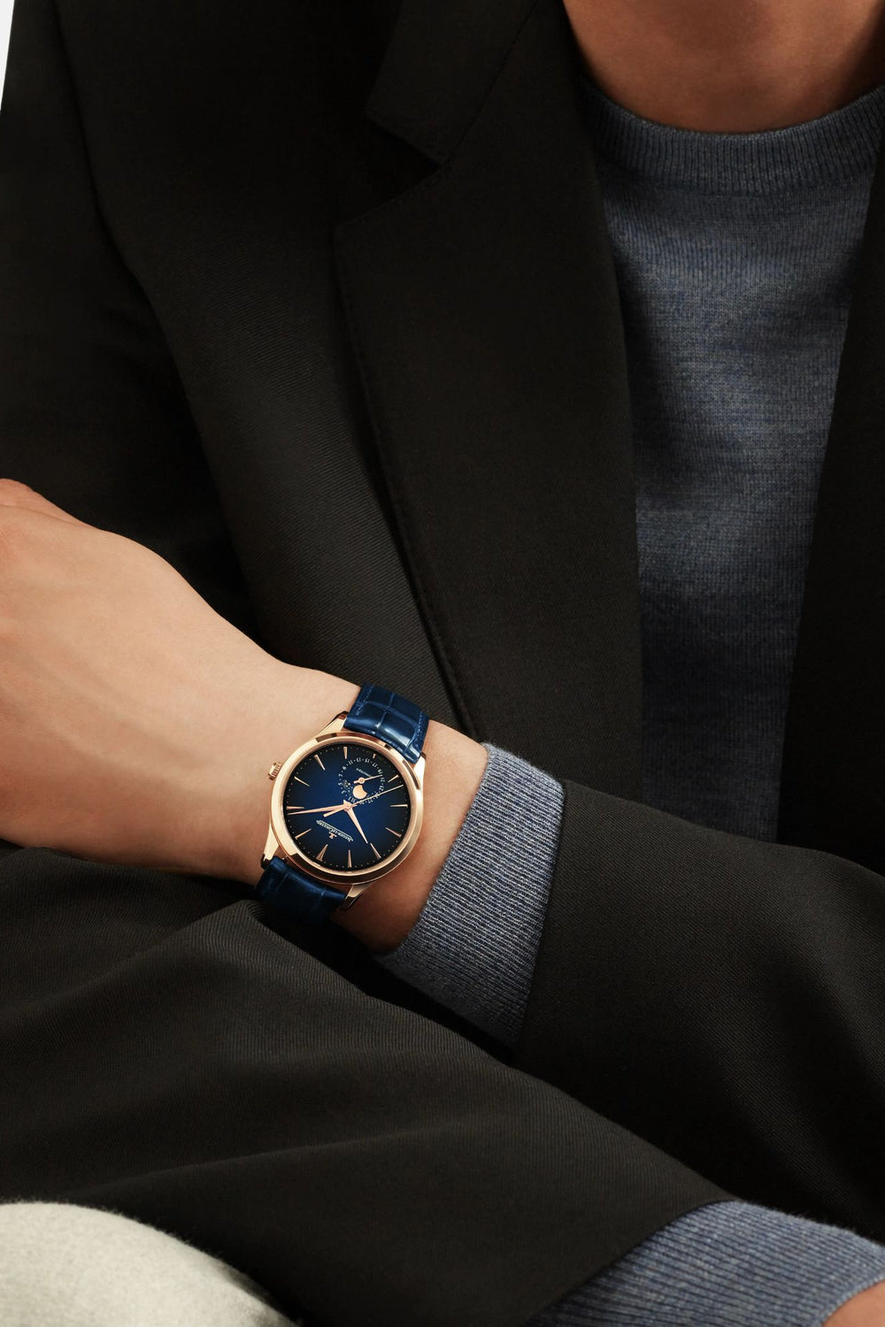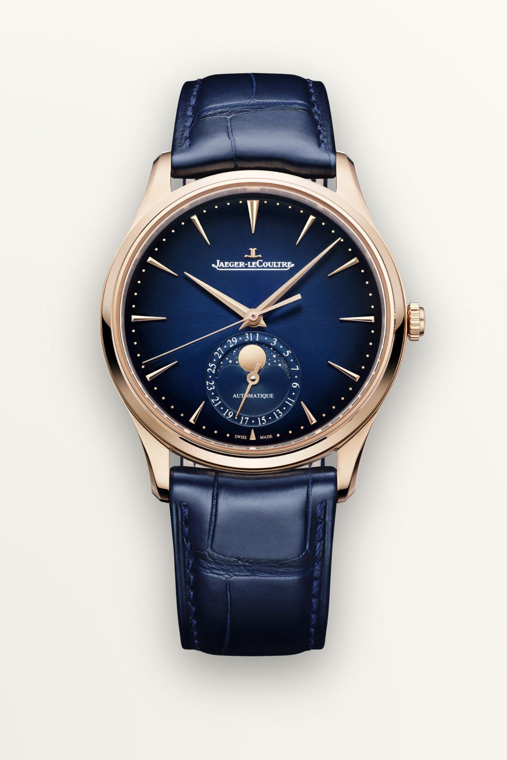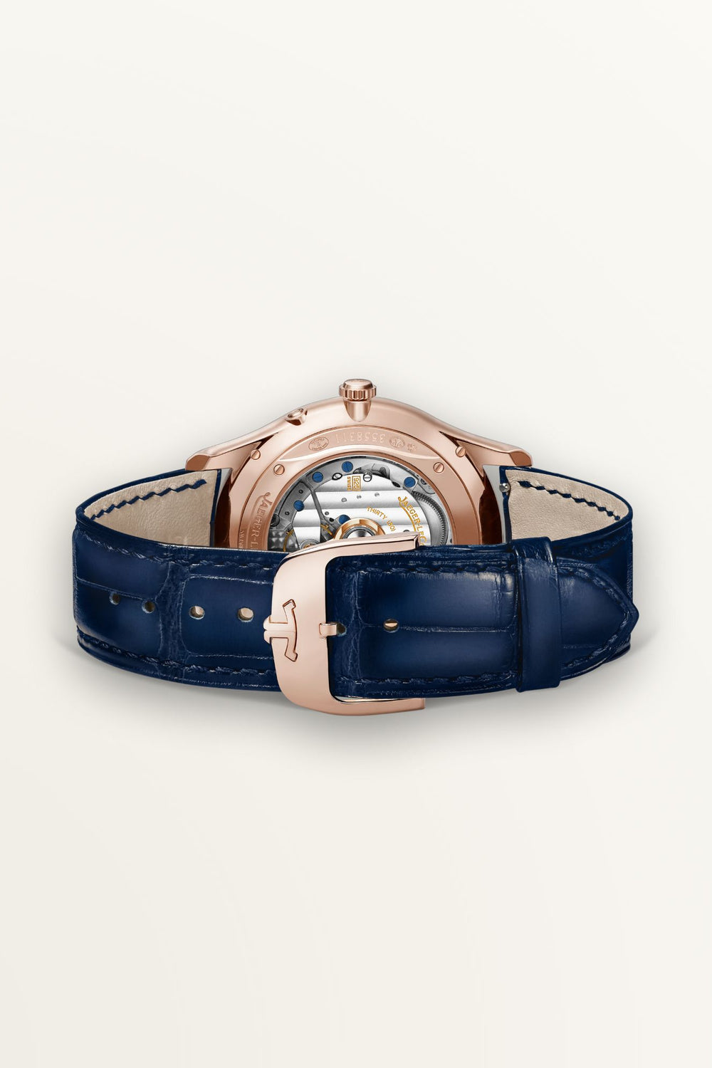 El nuevo Master Ultra Thin Moon luce una esfera con acabado de rayos de sol en un tono azul oscuro, intenso y ligeramente ahumado. Con un diseño tan complejo como detallado, este degradado en azul medianoche refleja el color de la correa de cuero de caimán azul oscuro. Esta declaración cromática contrasta magníficamente con la caja de oro rosa pulido con asas perfiladas, los índices aplicados, las manecillas Dauphine y el minutero. Una ventanilla situada las seis en punto muestra las fases lunares, una emblemática complicación de la colección Master Ultra Thin, que encaja perfectamente en un fascinante fondo de tonalidades azules. El equilibrio estético es extraordinario. Totalmente creado, decorado y montado en la Manufactura, el calibre automático 925 de Jaeger-LeCoultre promete 70 horas de reserva de marcha.