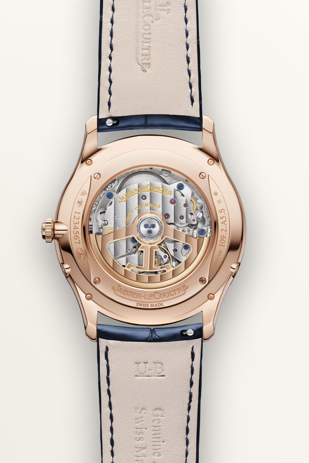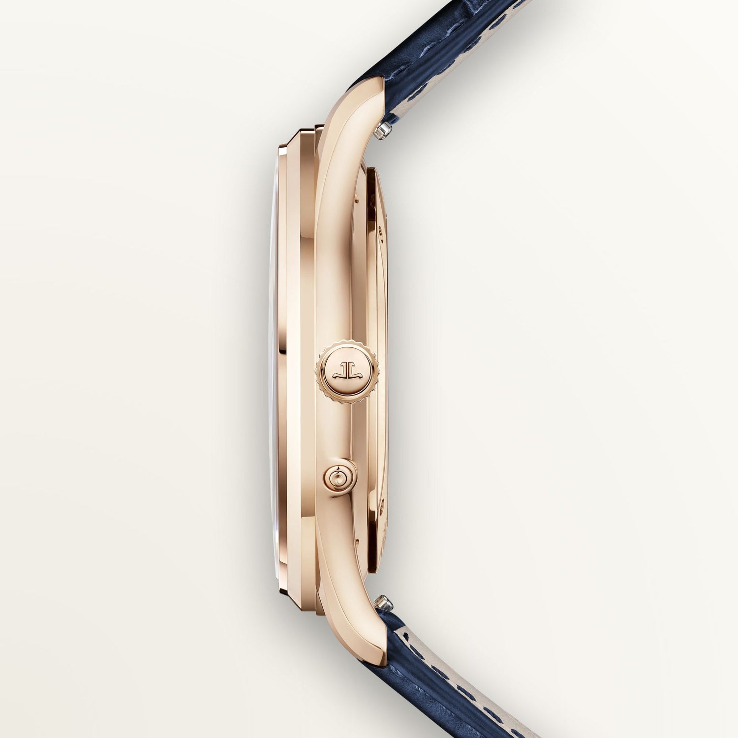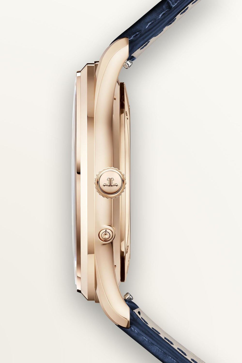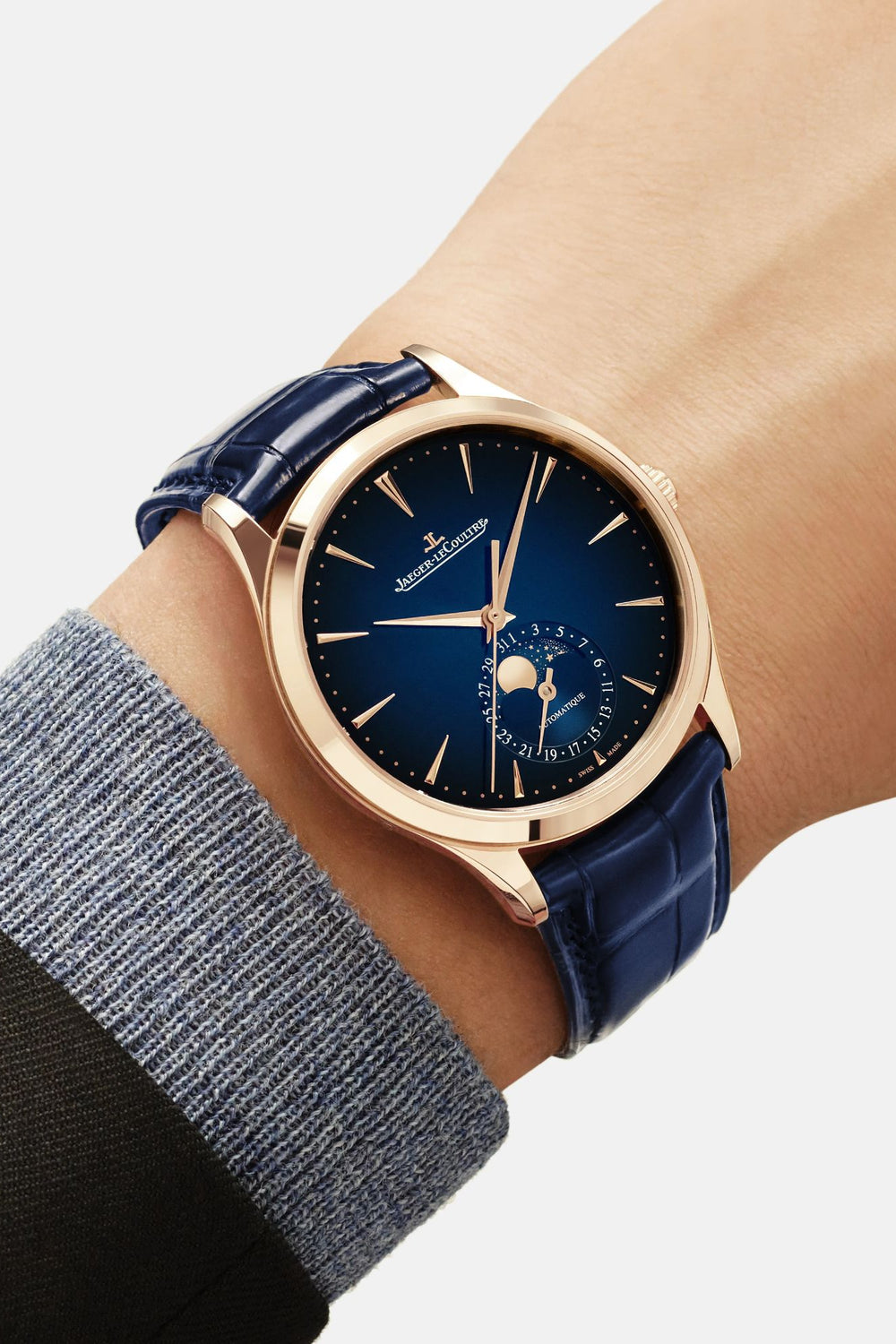 El nuevo Master Ultra Thin Moon luce una esfera con acabado de rayos de sol en un tono azul oscuro, intenso y ligeramente ahumado. Con un diseño tan complejo como detallado, este degradado en azul medianoche refleja el color de la correa de cuero de caimán azul oscuro. Esta declaración cromática contrasta magníficamente con la caja de oro rosa pulido con asas perfiladas, los índices aplicados, las manecillas Dauphine y el minutero. Una ventanilla situada las seis en punto muestra las fases lunares, una emblemática complicación de la colección Master Ultra Thin, que encaja perfectamente en un fascinante fondo de tonalidades azules. El equilibrio estético es extraordinario. Totalmente creado, decorado y montado en la Manufactura, el calibre automático 925 de Jaeger-LeCoultre promete 70 horas de reserva de marcha.
