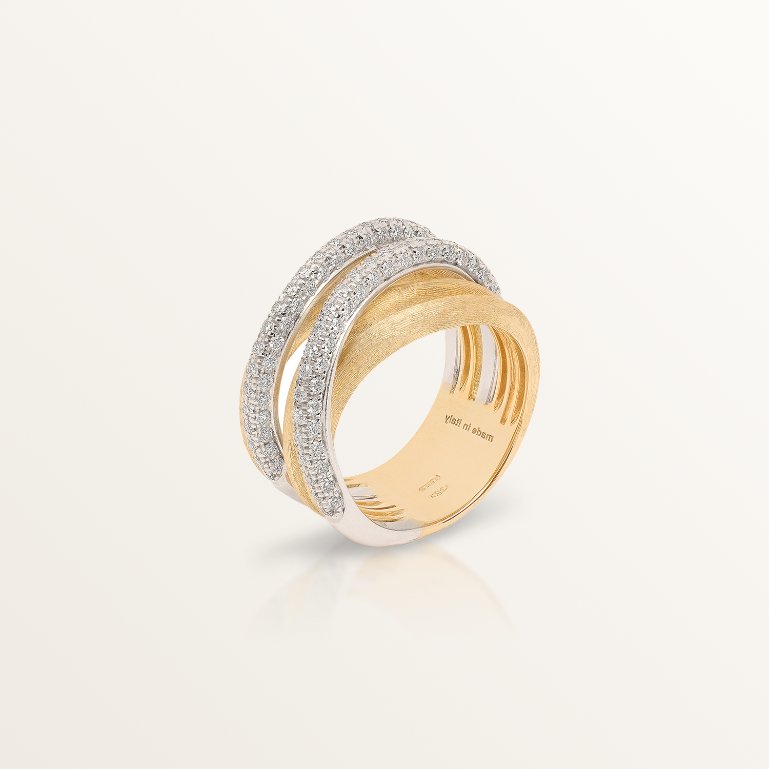 Este sofisticado y elegante anillo entrelaza dos bandas de diamantes pavé con bandas de oro amarillo de 18 kt, finamente grabadas a mano con la antigua técnica florentina.