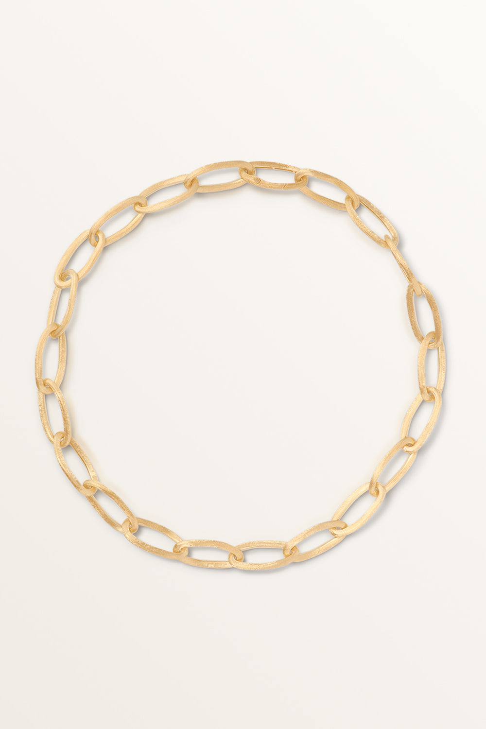 Este collar, audaz y elegante, presenta un juego equilibrado de volúmenes llenos y vacíos. La cadena está compuesta por elementos ovalados de oro amarillo de 18 kt, finamente grabados a mano con la antigua técnica florentina, que le confiere a nuestro oro una textura fina y cepillada.