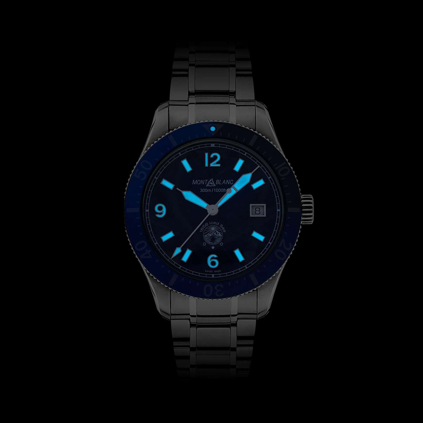 El Montblanc Iced Sea Automatic Date, el primer reloj de buceo deportivo de Montblanc, se caracteriza por el motivo de glaciar de la esfera, gracias al cual nos adentramos en las profundidades de esta masa de hielo. Esta esfera negra con motivo de glaciar se inspira en el Mer de Glace (mar de Hielo, en español), el principal glaciar del macizo del Mont Blanc. La textura se ha logrado mediante una técnica ancestral prácticamente olvidada que se denomina gratté-boisé. El reloj se presenta en una caja de acero de 41 mm y cuenta con un bisel unidireccional de cerámica bicolor, una tapa trasera grabada y una pulsera de acero biselada intercambiable con un ajuste preciso. El reloj cumple la norma ISO 6425 para los relojes de buceo y es resistente al agua hasta 300 metros.