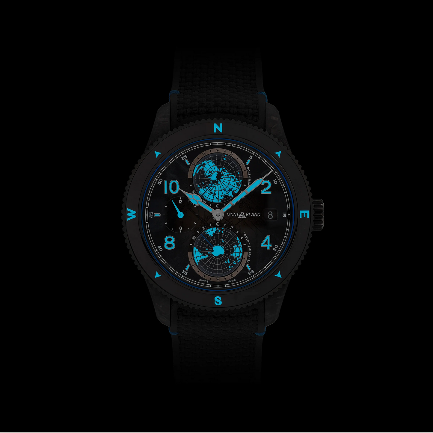 Con esta edición limitada de diseño contundente y gran innovación, Montblanc apuesta aún más que nunca por el concepto del oxígeno, el elemento clave en toda ascensión. El material de la caja, CARBO₂, se crea mediante un avanzado proceso de desarrollo que capta el CO₂ del biogás producido y los residuos minerales de plantas de reciclaje. Para dar aún más sentido a la temática aventurera, la caja de 43,5 mm, completamente libre de oxígeno, presenta un grabado del contorno azul y luminoso del Mont Blanc en el lateral y otro de la montaña, grabado con láser 3D en color, en la tapa trasera de titanio. El reloj está equipado con el movimiento automático MB 29.25 con complicación de hora mundial de Manufactura Montblanc, que incluye globos giratorios con hemisferios norte y sur, escala de 24 horas, indicaciones de día y noche, función Dual Time y fecha. La pieza se ve rematada por una correa de caucho negro intercambiable y biselada con un preciso sistema de ajuste y un motivo que evoca los tejidos utilizados por los alpinistas.