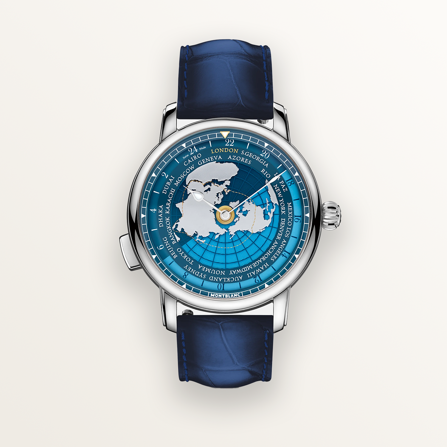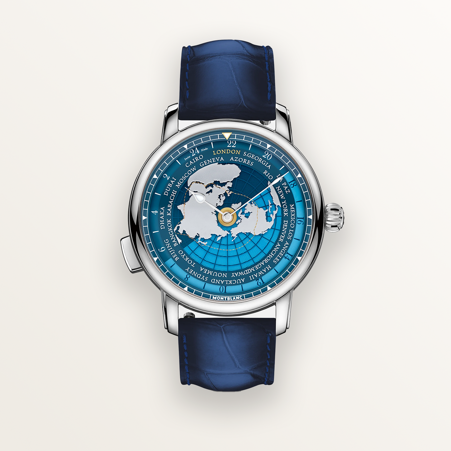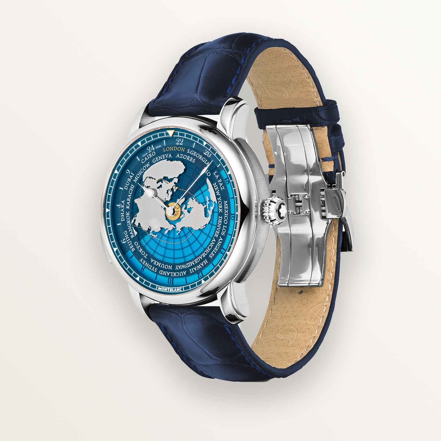 La historia del Montblanc Star Legacy Orbis Terrarum Edición Limitada - 360 piezas se remonta a 1872, cuando Julio Verne publicó su célebre novela La vuelta al mundo en 80 días. Esta famosa obra, un enredo de intriga y aventura, sigue cautivando hoy la imaginación de mayores y pequeños. La pieza está diseñada para acompañar a los aventureros, como Phileas Fogg y Passepartout, en sus viajes alrededor del mundo, gracias a su complicación de hora mundial de Manufactura, que permite leer 24 husos horarios en un solo vistazo. El periplo de Phileas Fogg aparece representado mediante 80 rayas doradas sobre una esfera de varios niveles que representa un mapamundi, dispuesto en torno al Polo Norte y con un movimiento rotatorio accionado por el mecanismo. La tapa trasera de titanio presenta un grabado con láser 3D que aporta color, profundidad y realismo a la representación del elefante Kiouni, símbolo de majestuosidad y lealtad. La pieza se presenta en una caja de acero pulido de 43 mm y está equipada con el movimiento automático MB 29.20. Este reloj también está equipado con una correa intercambiable de piel de becerro azul con relieve de caimán. Las aventuras continúan incluso en el forro de la correa, repujado con monedas chinas y hojas Boteh descubiertas en el trayecto de 80 días.