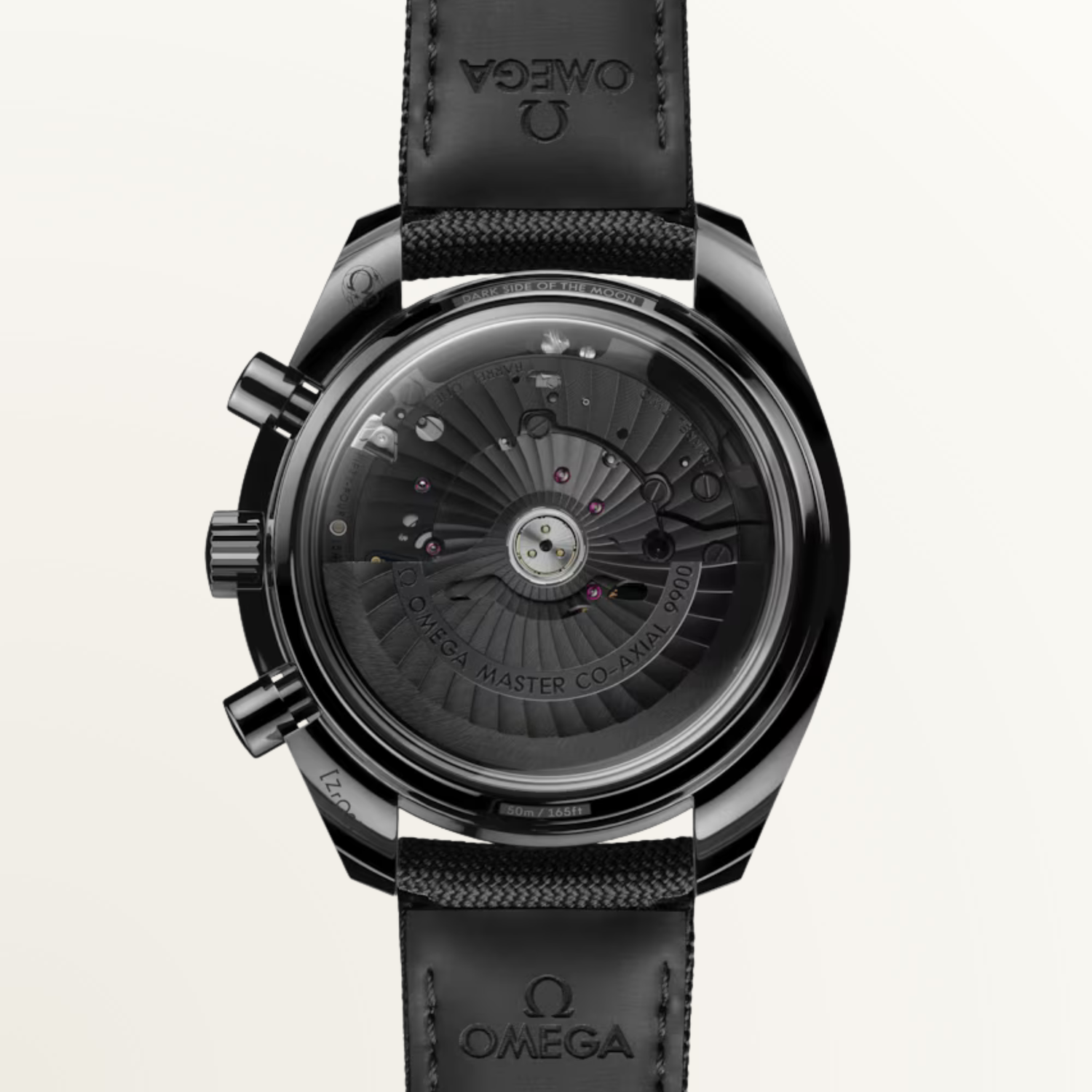 Visible a través del fondo de caja, el movimiento OMEGA Co-Axial Master Chronometer calibre 9900 de carga automática ha recibido un acabado especial por medio de un tono mate ennegrecido en el rotor, la pletina principal y los puentes, así como grabados barnizados en color negro. El reloj se presenta con una pulsera de tejido de poliamida sintética negro equipada con un cierre desplegable de cerámica y asas de titanio ceramizado con pasadores de resorte adaptables.