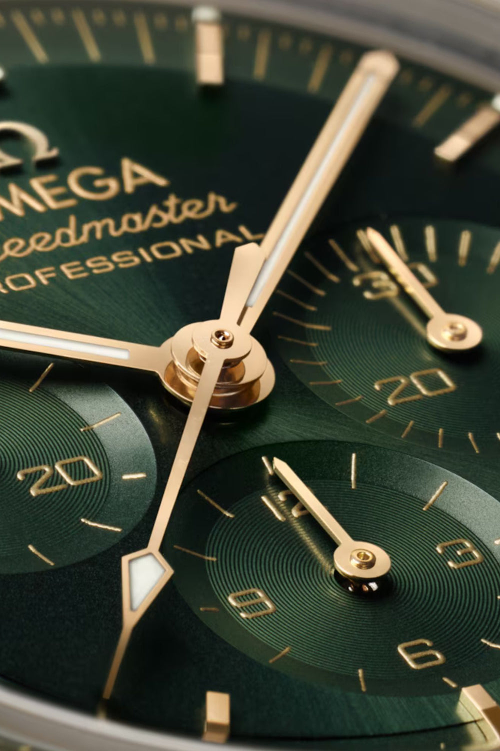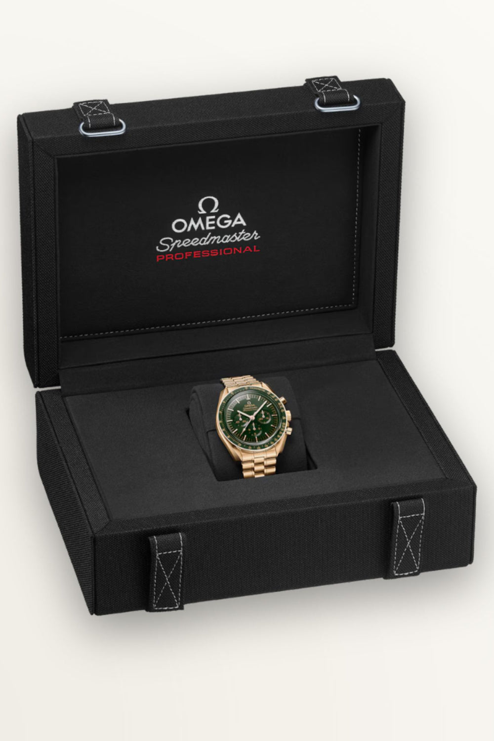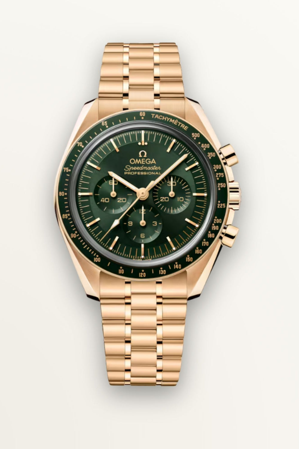Este Moonwatch de 42 mm con caja y brazalete de oro Moonshine™ de 18 qt está inspirado en la 4.ª generación del Speedmaster, y cuenta con una esfera "escalonada" de PVD verde con cepillado solar y agujas estilo "Moonwatch". El aro del bisel de cerámica verde con escala taquimétrica de OMEGA Ceragold™ incorpora la famosa marcación "Dot over 90".