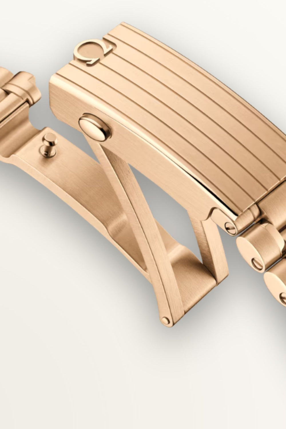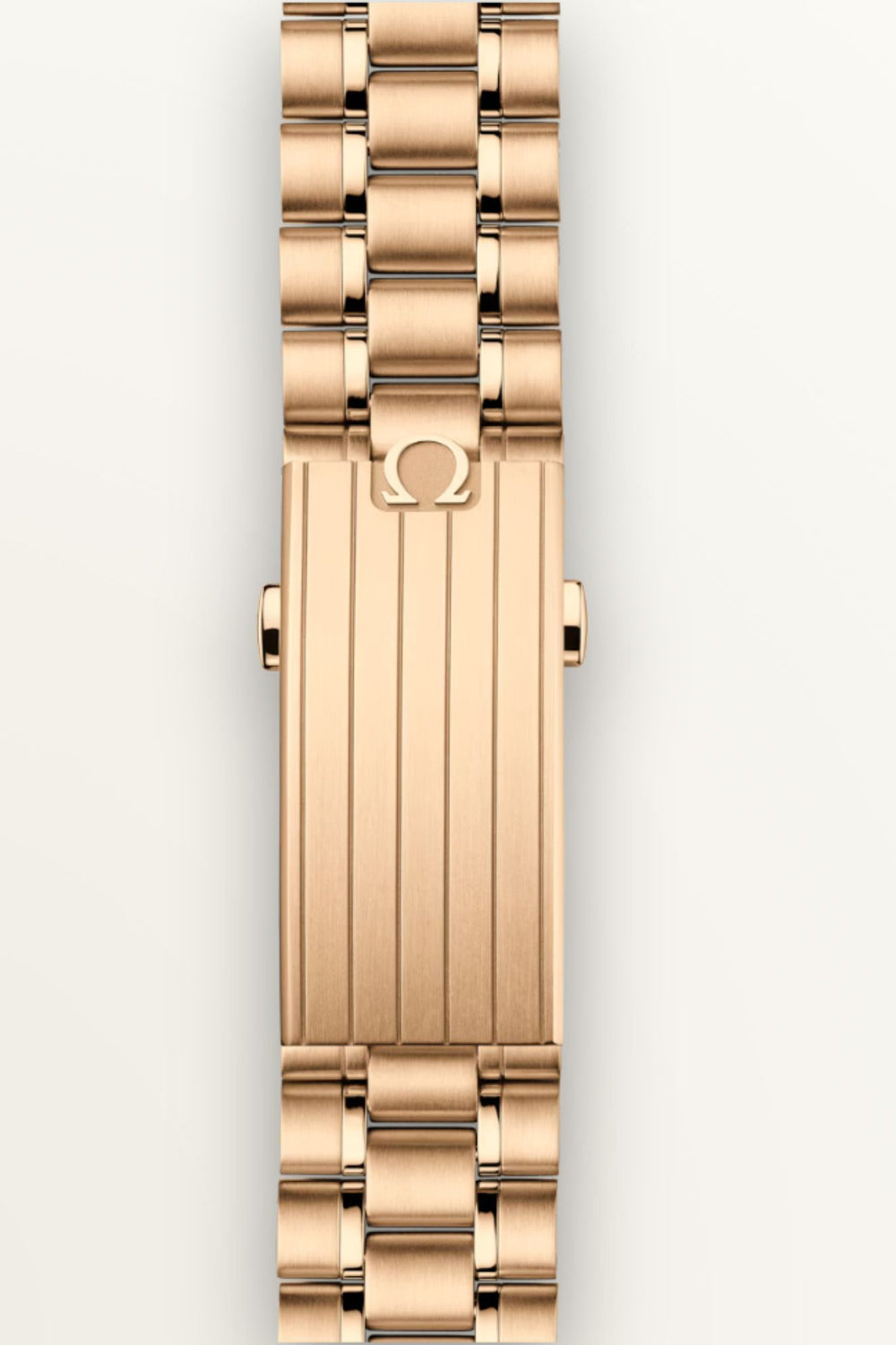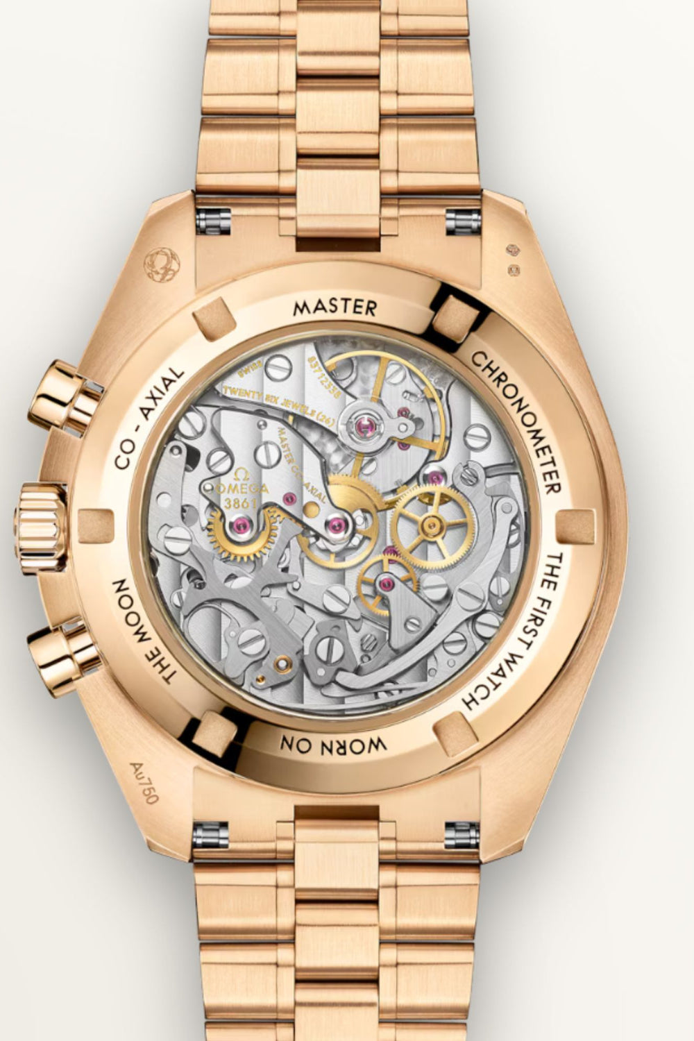 Este Moonwatch de 42 mm con caja y brazalete de oro Moonshine™ de 18 qt está inspirado en la 4.ª generación del Speedmaster, y cuenta con una esfera "escalonada" de PVD verde con cepillado solar y agujas estilo "Moonwatch". El aro del bisel de cerámica verde con escala taquimétrica de OMEGA Ceragold™ incorpora la famosa marcación "Dot over 90".