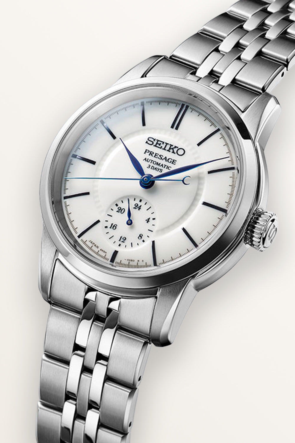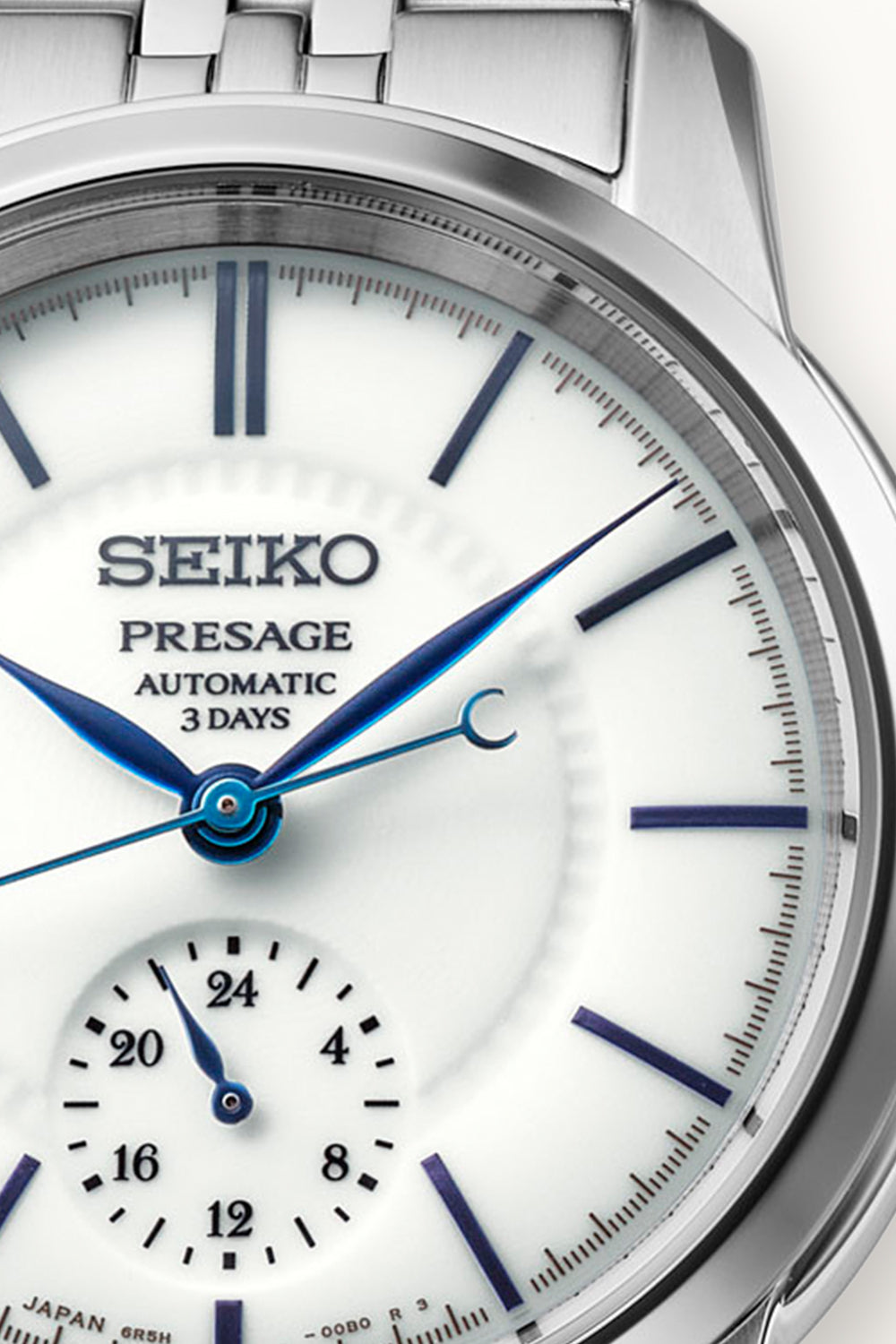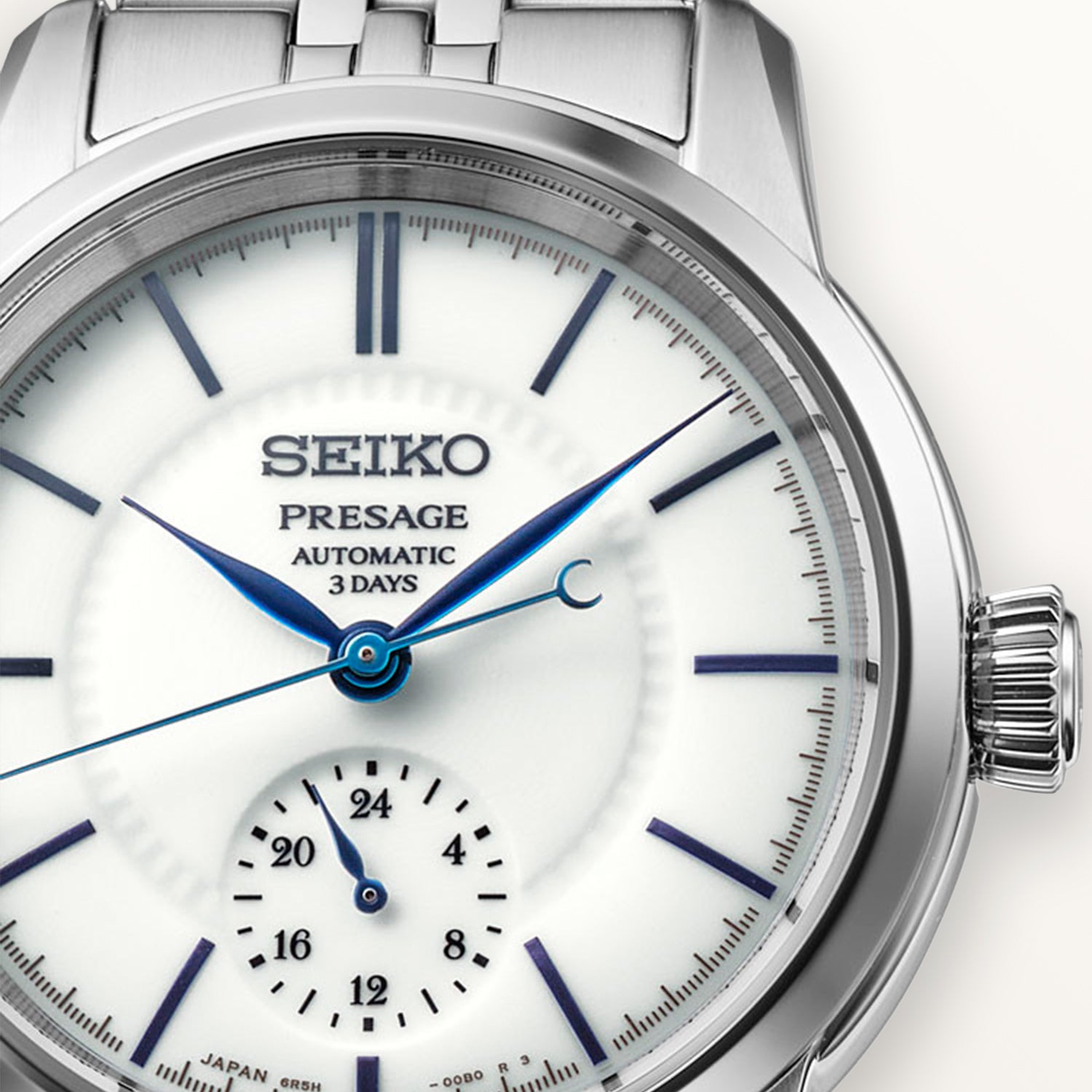 Seiko Presage Craftsmanship Series Esfera de Porcelana Arita. Esta creación presenta una esfera de "Hakuji" que resalta el color blanco puro del material de porcelana a través de una aplicación de esmalte transparente. Se han utilizado simples índices en barra para no restar protagonismo al brillo de la porcelana, una cualidad que se realza por la superficie curva de la circunferencia exterior de la esfera. En la esfera, que mide 31,6 mm de diámetro, el área justo dentro de los índices está decorada con un delicado patrón, y el subdial en la posición de las 6 en punto está hundido para lograr un sombreado sutil.