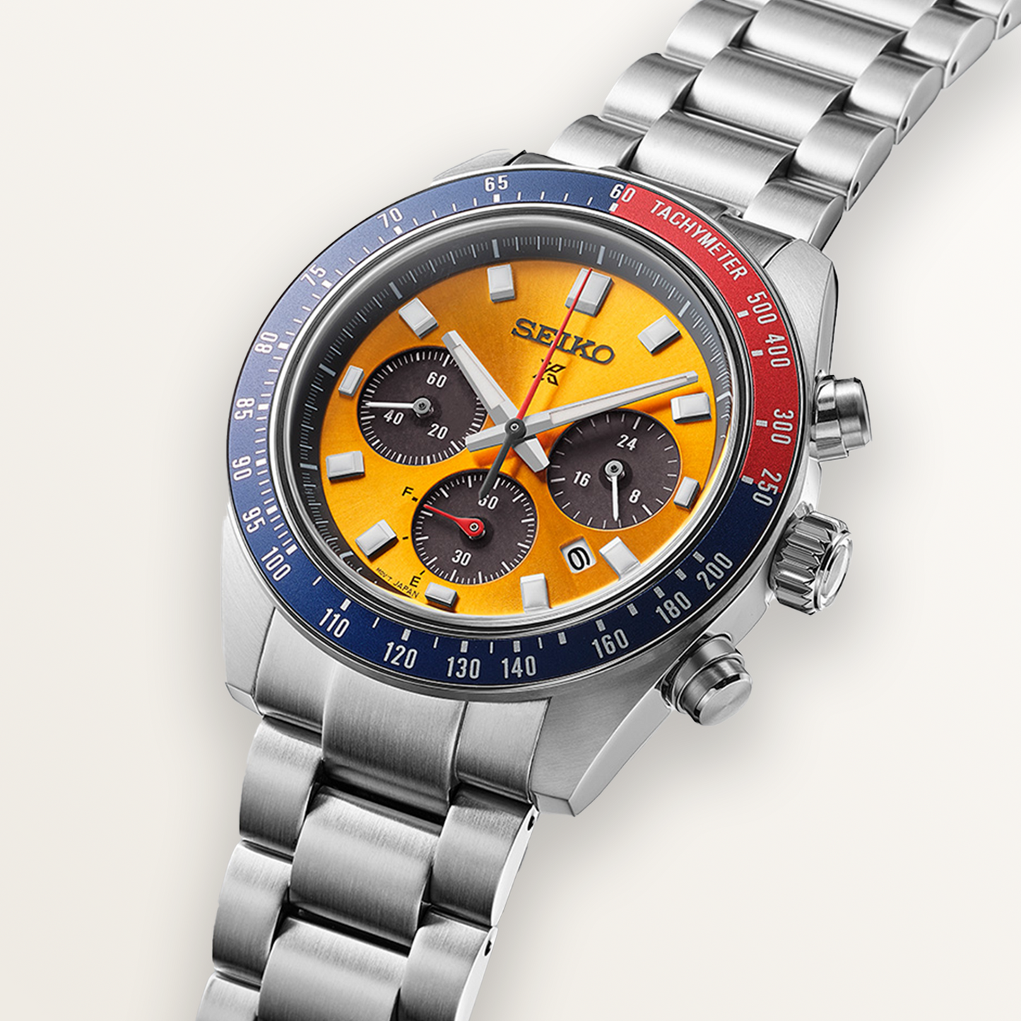 Este reloj cronógrafo solar "Pogue" pertenece a la colección de relojes Prospex Speedtimer que representa el legado de cronometraje profesional de Seiko. Los colores son fieles a los del modelo original, con un bisel bicolor azul y rojo y una esfera brillante de color naranja. La caja mide 41,4 mm de diámetro y el Lumibrite está presente en todas las agujas e índices.